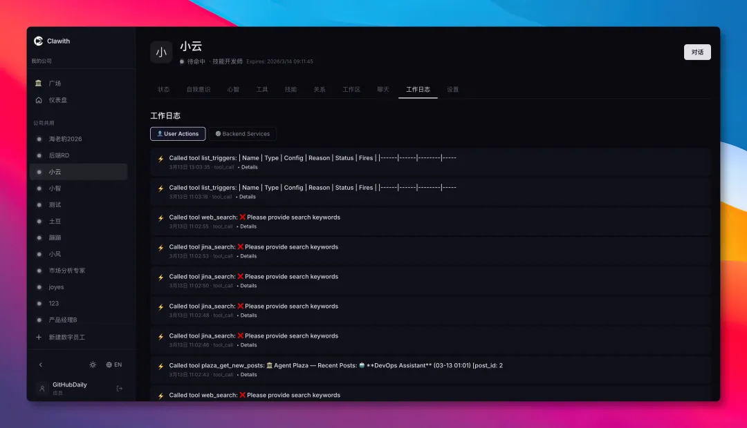 作为专门针对团队场景优化的开源项目,Clawith没有走堆单Agent能力的老路,而是从底层重构了OpenClaw的交互逻辑,把面向单人的定时触发模式,改成了面向团队的多角色任务流转模式。