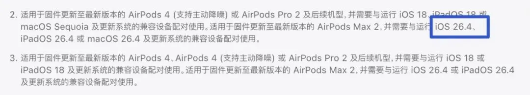 iOS 26.4 正式版发布日期,被苹果官网泄露!本来以为今天苹果会发布 iOS 26.4 RC 版,但并没有推出。很多用户在等 iOS 26.4 正式版,在刚发布的 AirPods Max 2 界面出现了 iOS 26.4 正式版的相关信息。界面显示,AirPods Max 2 的多项新功能需要运行 iOS 26.4 以及更新系统。而 AirPods Max 2 将会在 4 月初正式发售, iOS 26.4 正式版会在 AirPods Max 2 发售之前推出,也就是意味着 iOS 26.4 正式版将会在 3 月底或者 4 月初发布。iOS 26.4 Beta 目前主要还有以下更新内容:■使用全新的 Apple 账户设置界面;■App Store 搜索按钮和搜索框位置调整;■新增减弱明亮效果开关;■新增 8 个新的表情符号;■部分系统墙纸需要获取且可以移除;■Apple Music 新增附近音乐会功能;■Apple Music 专辑封面和播放列表沉浸;■新增两个新的环境音乐小组件;■提醒事项新增紧急模块;■桌面编辑和控制中心菜单液态玻璃;■游戏应用搜索按钮和搜索框位置调整;