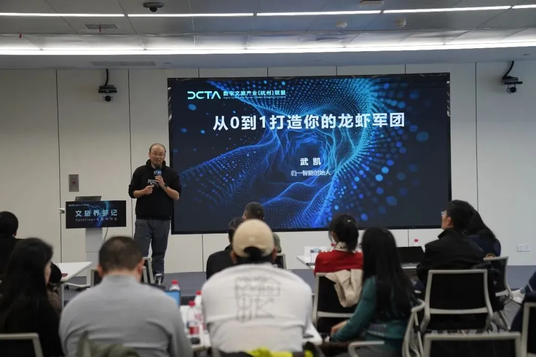 “文旅养虾记”OpenClaw+文旅研讨会在杭举办,共探“人工智能+”文旅协同新生态3月13日,“文旅养虾记”OpenClaw+文旅研讨会在杭州市浙数文化科技园成功举办。活动聚焦以OpenClaw为代表的智能体发展现状及其在文旅领域的应用展望,吸引政府、高校、文旅企业及行业协会代表等百余人参会。本次活动由杭州市文化和旅游发展中心(杭州市旅游经济实验室)指导,数字文旅产业(杭州)联盟、杭州数字文旅产业园、浙数图影科技(杭州)有限公司主办。归一智能创始人武凯结合自身养虾经验,围绕“龙虾智能体”的本地部署与实际应用展开分享。武凯强调,“龙虾智能体”的应用,首先要解决安全风险,务必避免文件丢失或隐私泄露。而后武凯通过实机演示如何通过养虾,完成PPT生成、知识库提炼、公众号内容聚合及网站数据分析等全流程自动化操作,预示“龙虾智能体”正在构建人机协作的新模式。武 凯