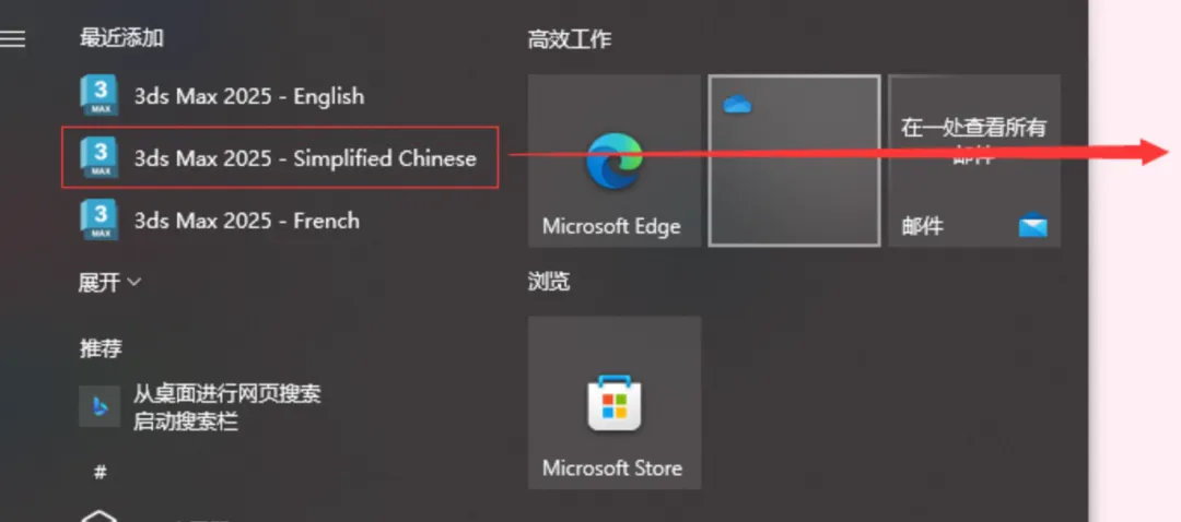 9.创建3ds Max桌面快捷方式:①点击桌面任务栏中的【开始图标】>点击【所有应用】>双击展开【Autodesk】文件夹②将【3ds Max 2025- Simplified Chinese】图标拖到电脑桌面。