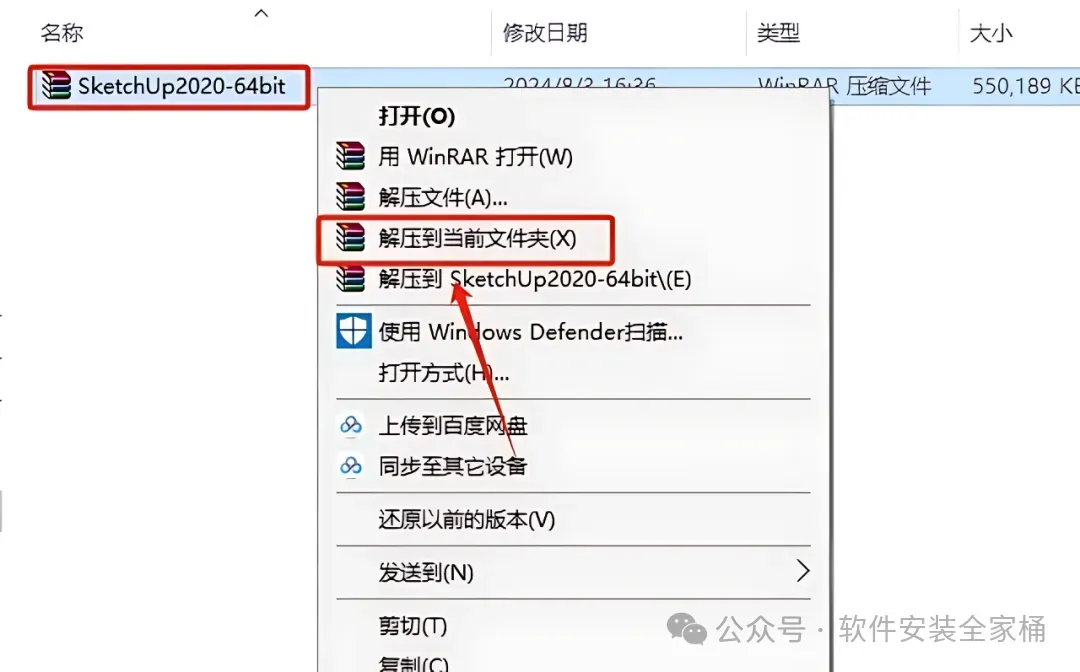 1.打开下载好的SketchUp安装包,鼠标右击压缩包选择【解压到当前文件夹】。