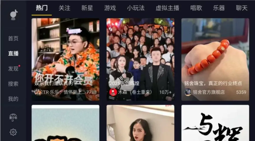 直播内容超全:涵盖游戏、互动、虚拟偶像、音乐、聊天等多种分类,总有你爱看的。