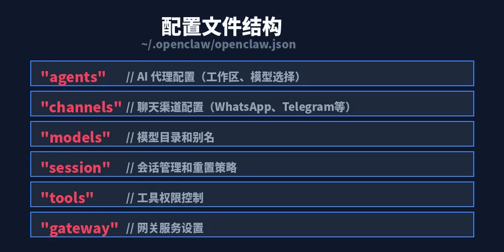 配置文件位置:~/.openclaw/openclaw.json{ "agents": { "defaults": { "workspace": "~/.openclaw/workspace", "model": { "primary": "alibaba-bailian/qwen3.5-plus" } } }, "channels": { "whatsapp": { "enabled": true, "dmPolicy": "pairing" } } }agents - AI 代理配置(工作区、模型选择)channels - 聊天渠道配置(WhatsApp、Telegram 等)
