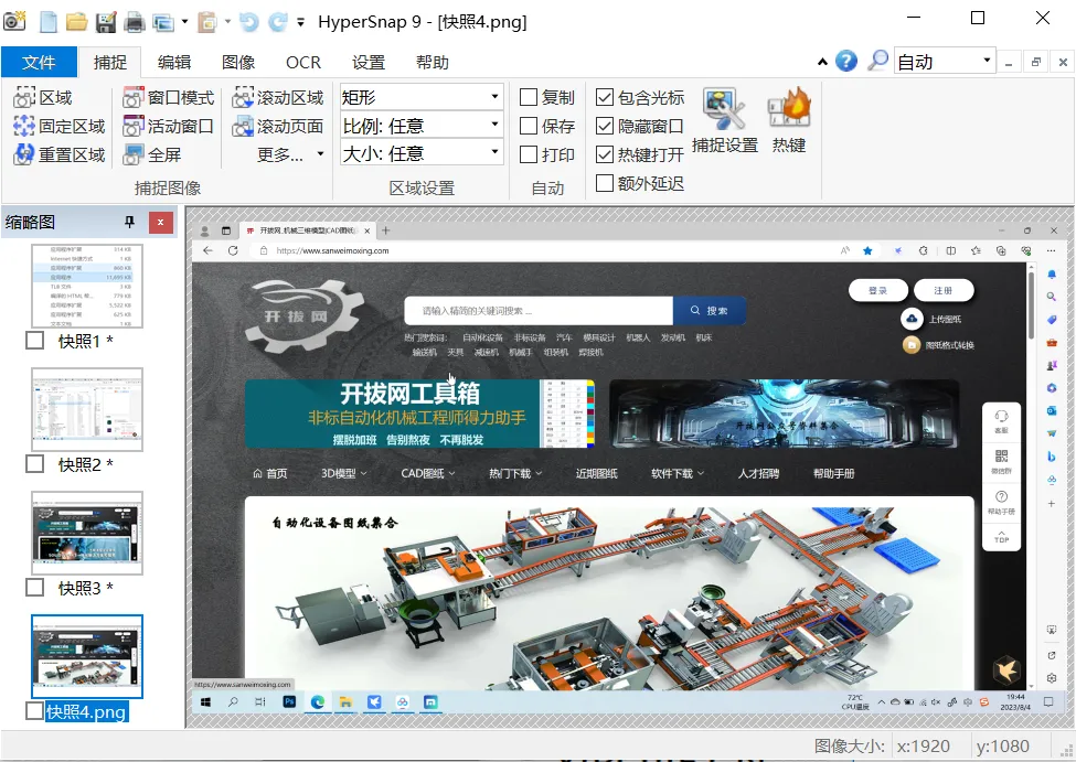 电脑截图截屏工具Hyper.snap支持图像的连续截取,截取后的图像显示在窗口工作区,可通过窗口缩略图视图逐一查看。