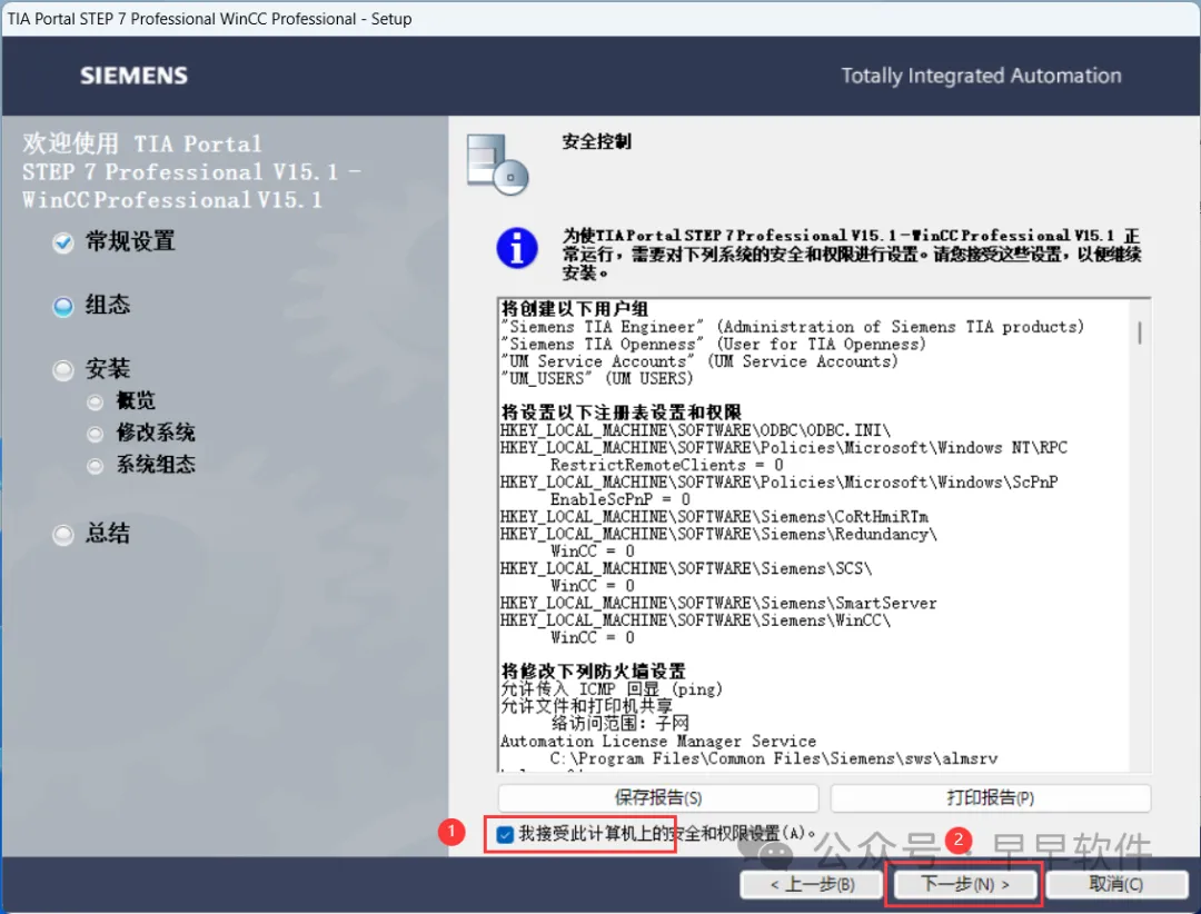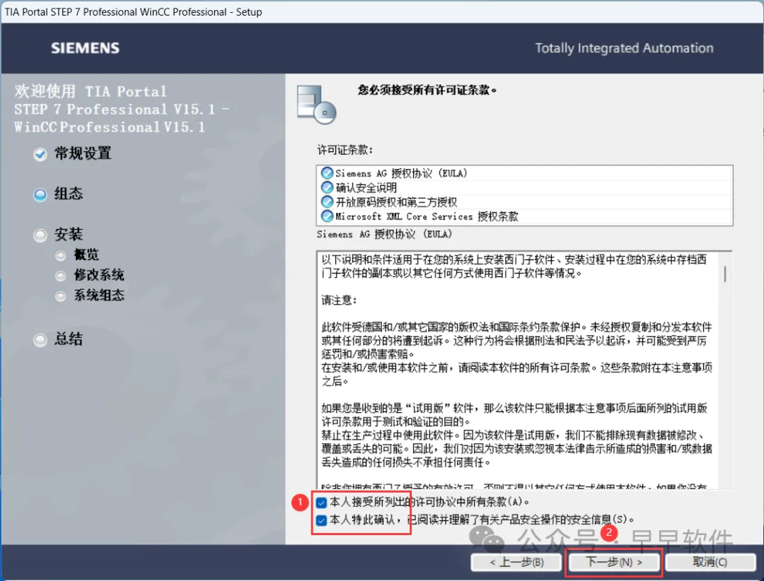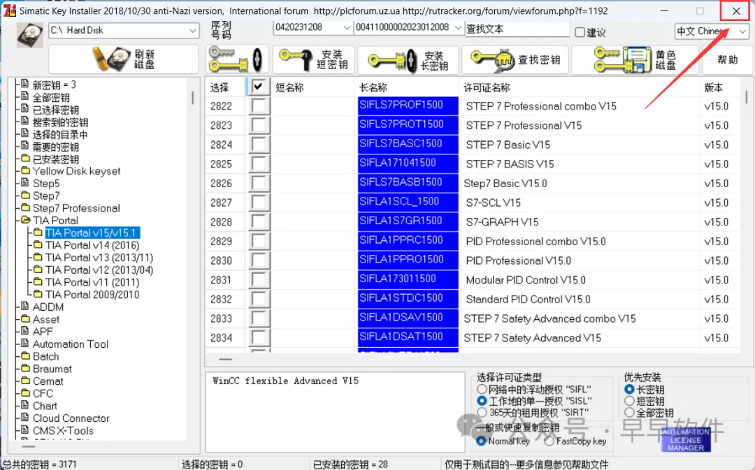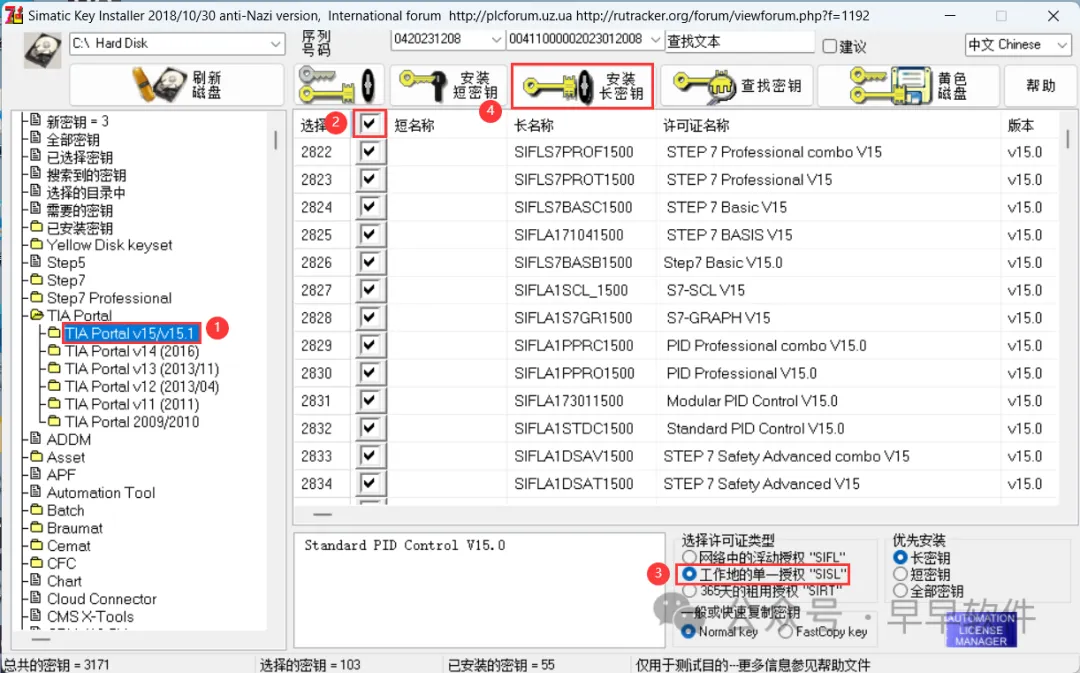 29、依次点击【TIA Portal V15.1】,全选【短名称】,勾选【工作地的单一授权“SISL”】,再点击【安装长密钥】