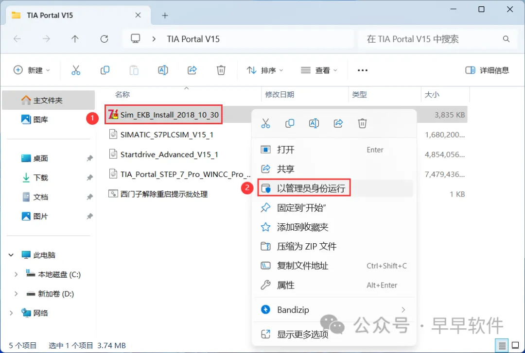 27、回到TIA Portal V15文件夹,找到【Sim_EKB_Install…】应用程序,右键选择【以管理员身份运行】它