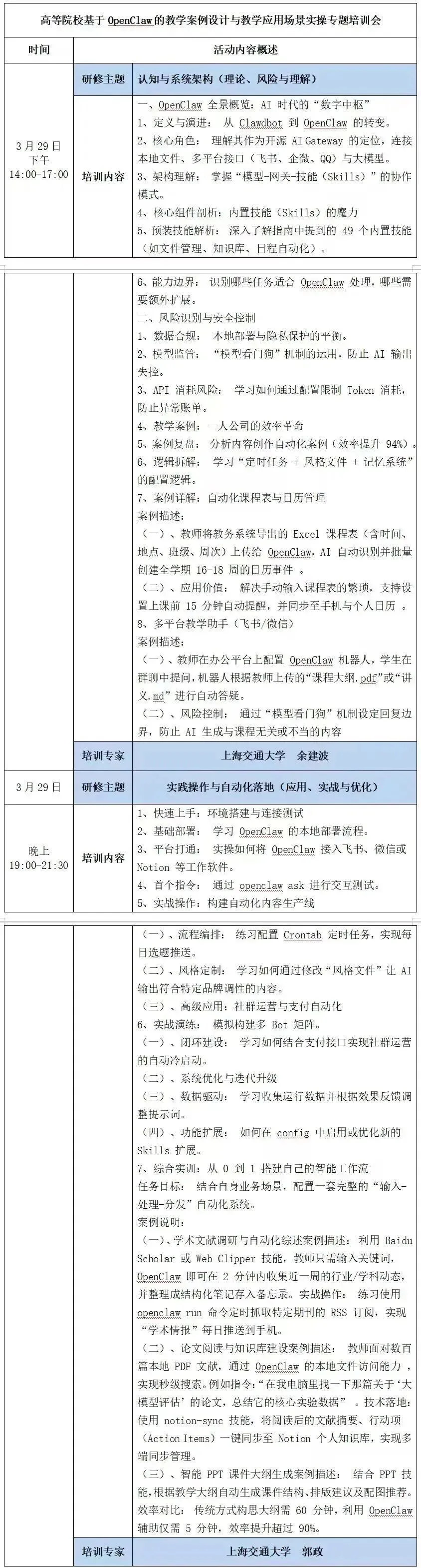当前AI技术正从“语言交互”向“实操落地”加速转型,OpenClaw作为热门开源AI智能体项目,让AI Agent真正走出实验室,成为可应用于教育教学场景的实用工具。为帮助高校教师了解OpenClaw核心能力,助力老师们将AI技术融入日常工作、提升工作效能,我单位于2026年3月29日在线上举办“高等院校基于OpenClaw的教学案例设计与教学应用场景实操专题培训会”。现将有关事项通知如下:01.