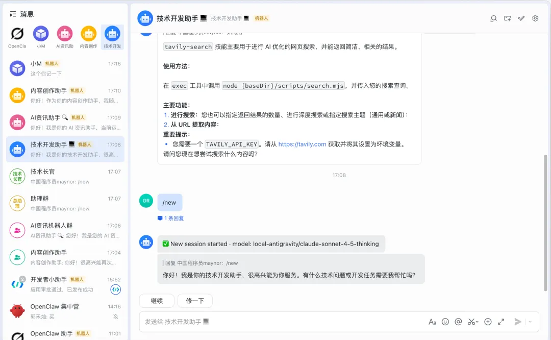 #### 2. 发送测试消息在飞书中找到您创建的机器人,发送一条消息,例如:"hi"。**在日志中应该能看到:**HEARTBEAT_OK hi connected | running agent main | session main (heartbeat) | local-antigravity/gemini-3-pro-high