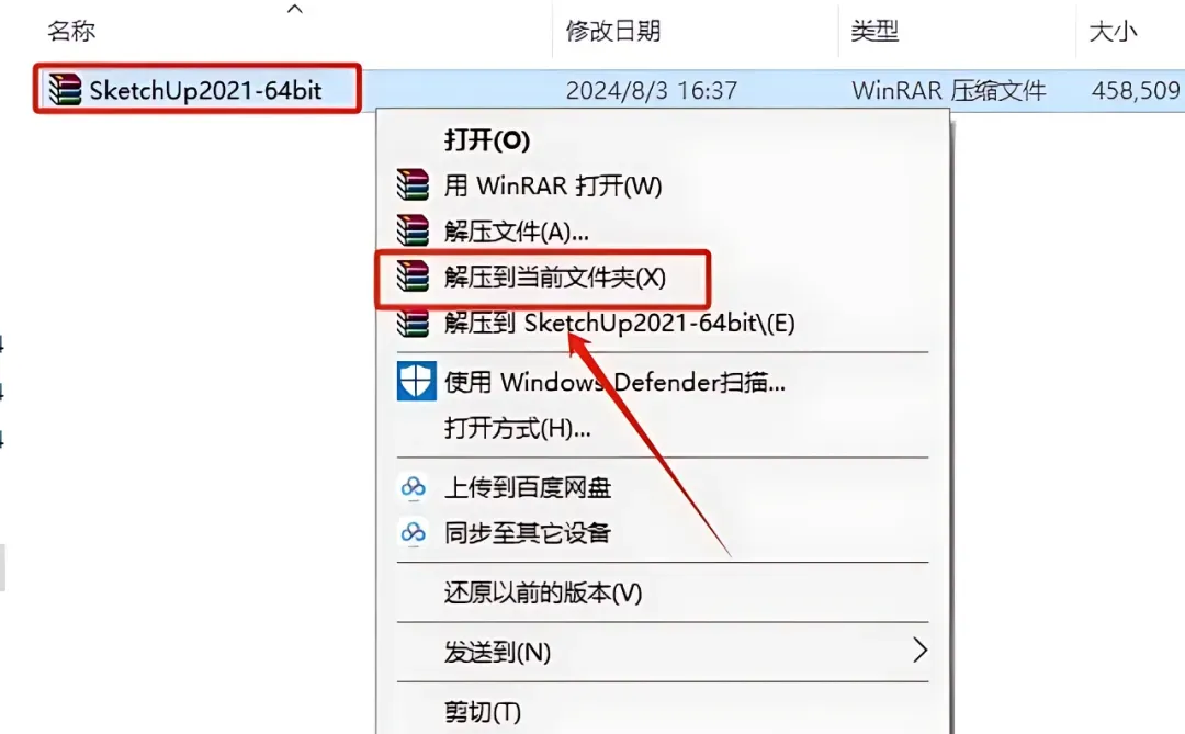 1.打开下载好的SketchUp安装包,鼠标右击压缩包选择【解压到当前文件夹】。