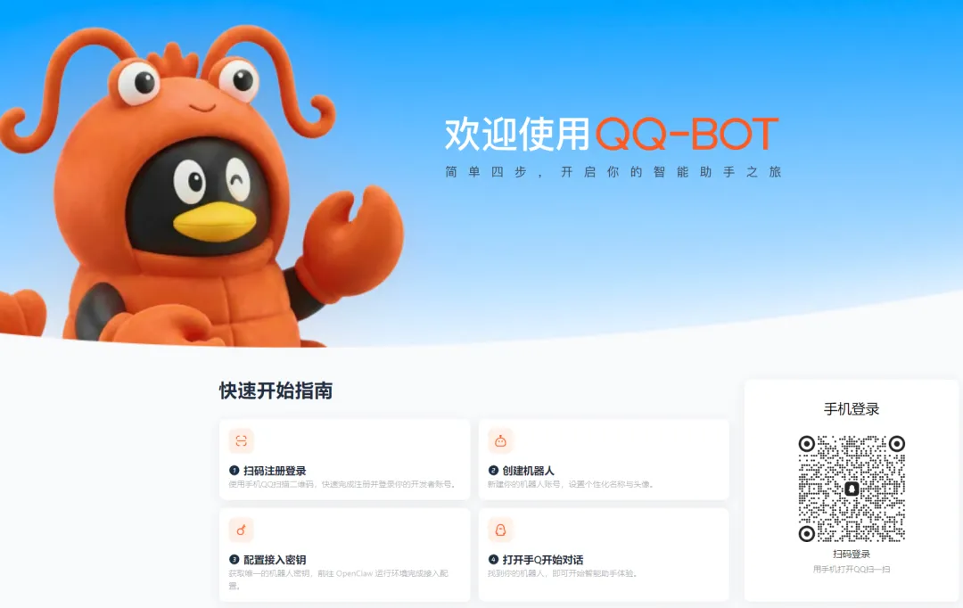 电脑浏览器打开指定 QQ 开放平台页面(https://q.qq.com/qqbot/openclaw/login.html),用手机 QQ 扫码登录开发者账号。