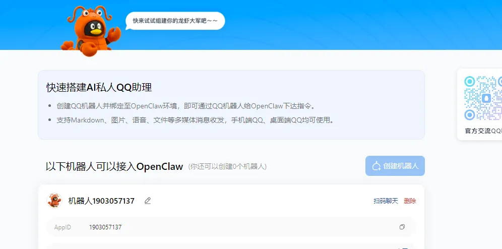 点击创建机器人,单个 QQ 账号可注册 5 只独立 AI 机器人,可自定义昵称、头像和简介,创建后需妥善记录 AppID 和 AppSecret(二次查看会重置),这是后续绑定的关键信息。(建议保存好 AppID 和 AppSecret,这是后续 OpenClaw 绑定它的身份证。)