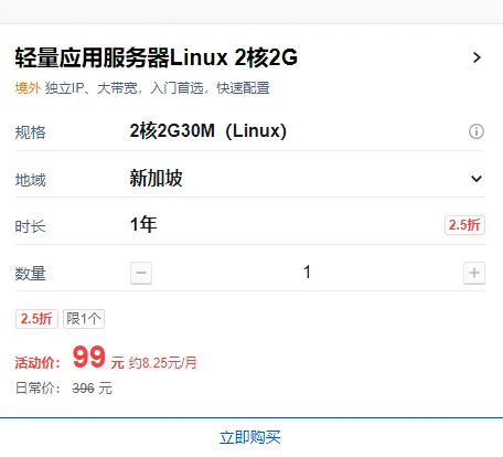 省心且服务器 24 小时在线,演示用的 2 核 2G 新加坡轻量服务器首年 99 元(日常 396 元)-一定要安装linux系统,不要装windows系统哦,windows系统无法一键部署 OpenClaw,这个活动服务器系统装错了不能换系统,而且退费很麻!
