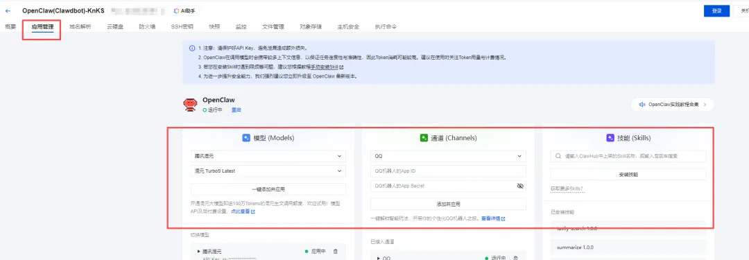 模型 (Models):可以选“腾讯混元”,现在开通免费 100 万 Tokens 额度,可以省 Tokens 费用! 通道 (Channels):选 QQ,填入刚才记下的 AppID 和 AppSecret,点击 添加并应用 即可。 技能 (Skills):默认自带基础技能,想解锁更多姿势可以去社区下载。(去社区自己下,很简单,你需要什么样的技能就去安装什么技能)