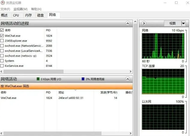 我们先看「资源监视器」栏目里面的「网络」给「WeChat」前面的方框打钩,因为是通过微信来发现好友的位置。