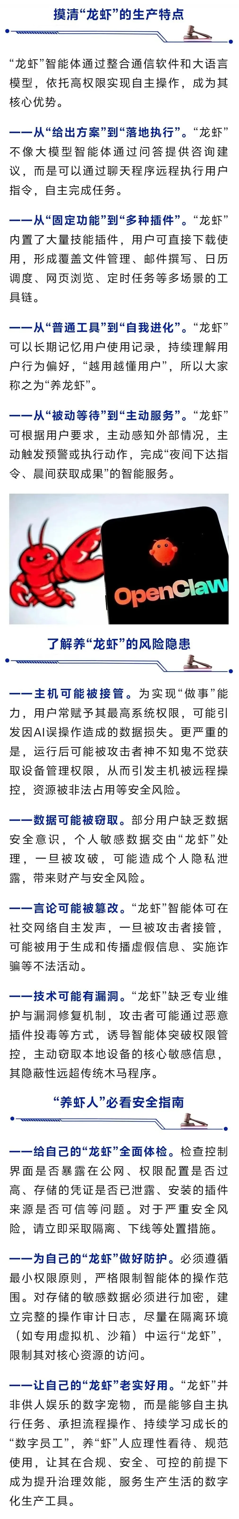 国安部发布“龙虾”(OpenClaw)安全养殖手册平安建设,普法同行——“平安课堂”开讲啦!这里有真实鲜活的案例,引人入胜的情节,专业在理的释法,只为让您涨姿势、少踩坑、不中招!莞人莞事,有趣有料,建议一键三连——点赞+评论+转发~OpenClaw(昵称“龙虾”)是一款开源AI智能体工具,上线不久便迅速成长为2026年度现象级“开源奇迹”。不少用户从付费安装“龙虾”,到付费卸载“龙虾”,养“龙虾”正在成为一场智能体的狂欢。但火热的“龙虾”在创新改变生活的同时,也存在原生风险。3月17日上午,国家安全部发布特别提示,广大用户要理性辨别、规范使用,以积极的心态和慎重的执行拥抱人工智能时代,让“龙虾”成为遵规守纪、产能高效的“数字员工”。来源:国家安全部欢迎关注:东莞政法