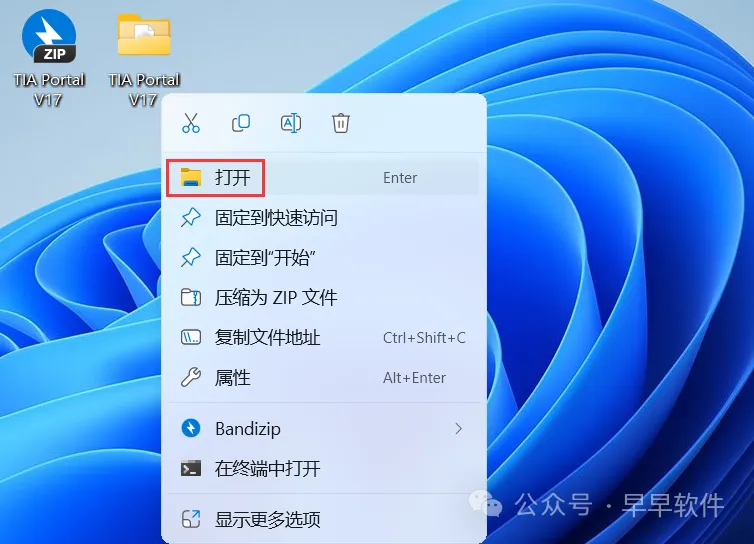 55、回到桌面,右键桌面上的【TIA Portal V17软件图标】,点击【打开】