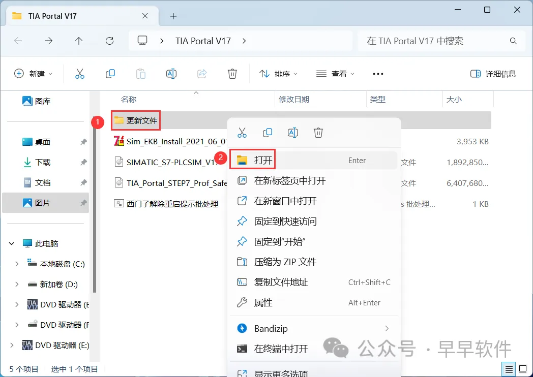 28、回到TIA Portal V17文件夹,找到【更新文件】文件夹,右键【打开】它
