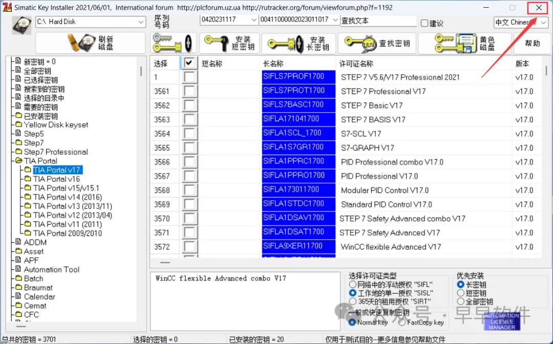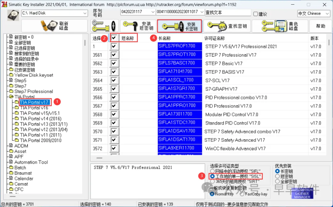 53、依次点击【TIA Portal V17】,勾选【短名称】,勾选【工作地的单一授权“SISL”】,再点击【安装长密钥】