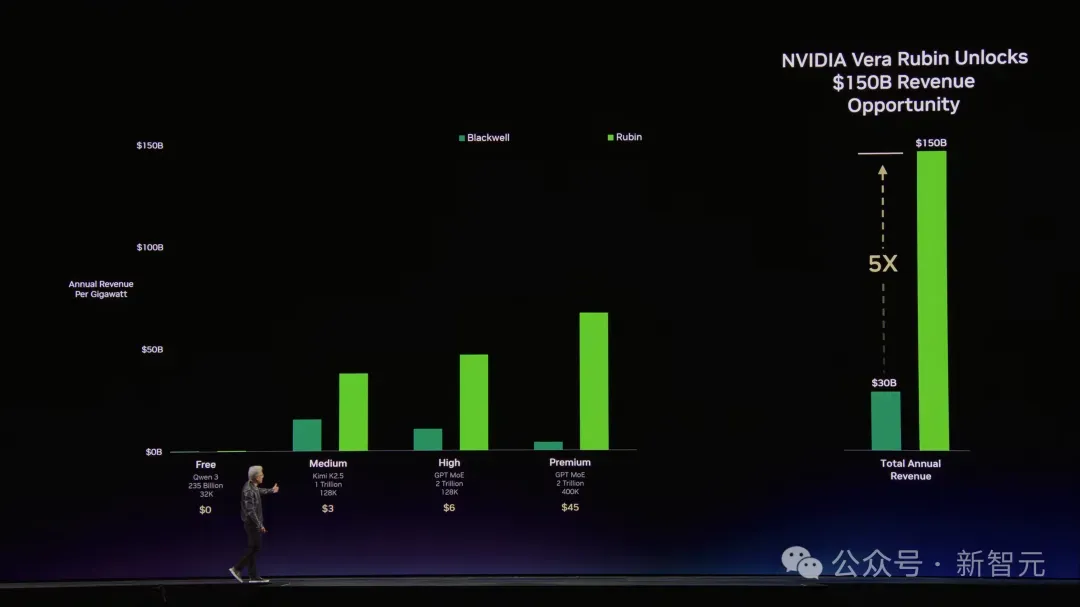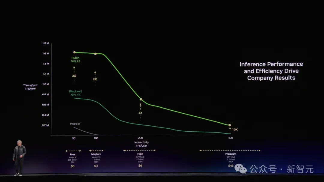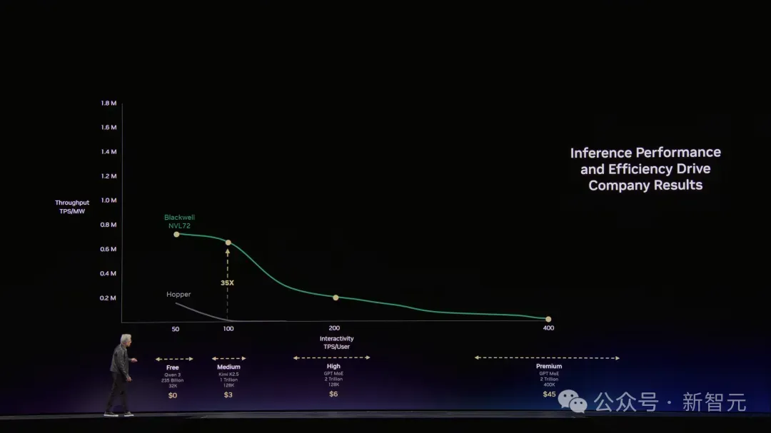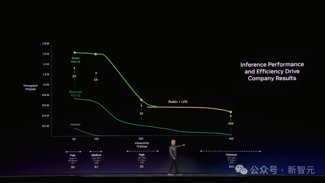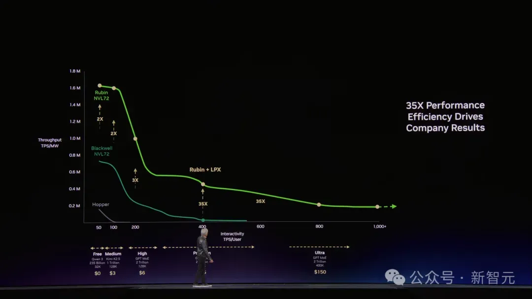 Hopper是起点,Grace Blackwell在每个价格档位上都把吞吐量拉高了35倍。Vera Rubin再在Blackwell基础上翻5倍。