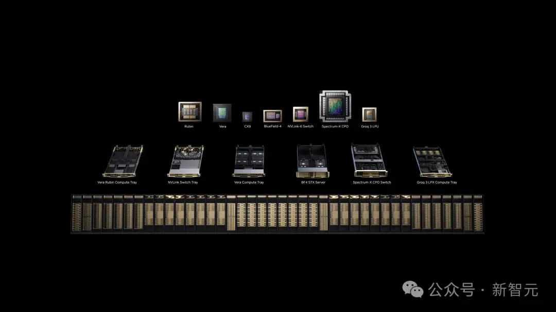 Rubin GPU、Vera CPU、NVLink 6交换机、ConnectX-9 SuperNIC、BlueField-4 DPU、Spectrum-6以太网交换机,以及新整合的Groq 3 LPU。