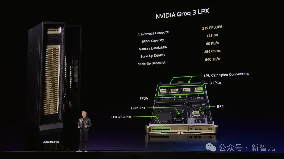 目前,Groq 3 LPU由三星代工,已进入量产,预计Q3出货。每个LPX机架包含256颗LPU,128 GB片上SRAM,640 TB/s规模扩展带宽。