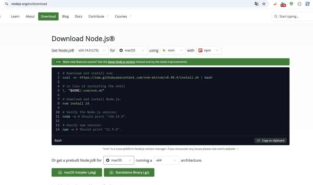 wget -qO- https://raw.githubusercontent.com/nvm-sh/nvm/v0.40.4/install.sh | bash然后安装并且切换到最新的NodeJS 的 TLS版本。