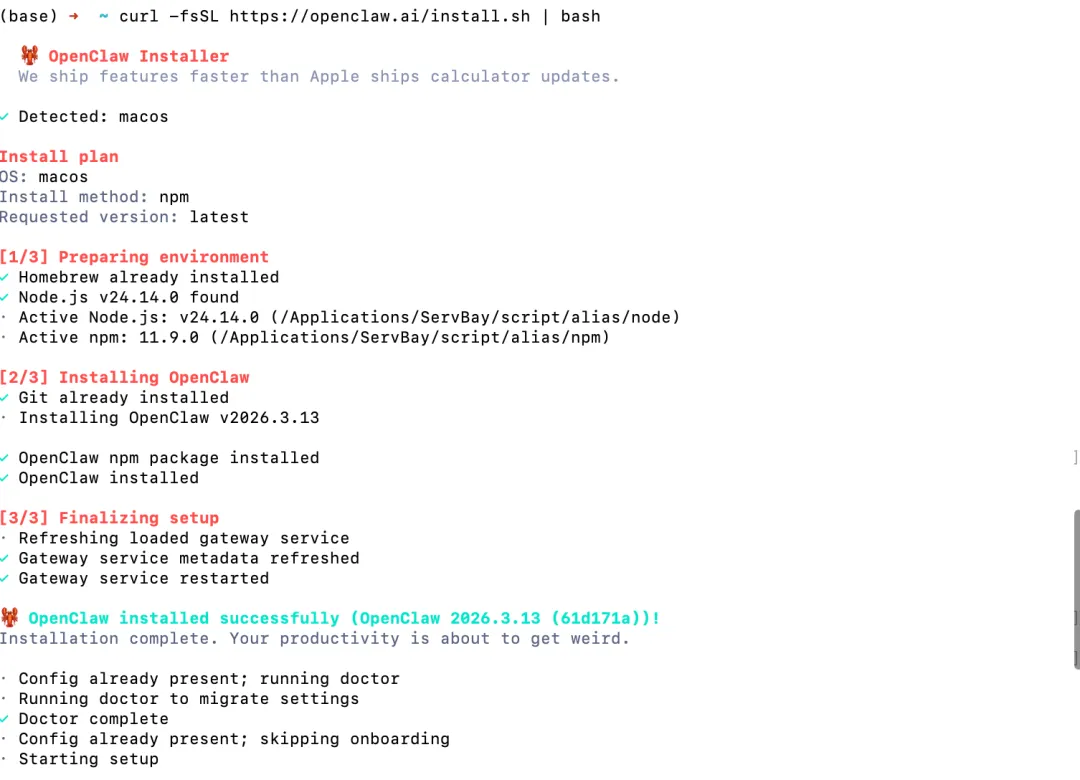 iwr -useb https://openclaw.ai/install.ps1 | iex这是我在MacOS下的安装过程,可以作为参考: