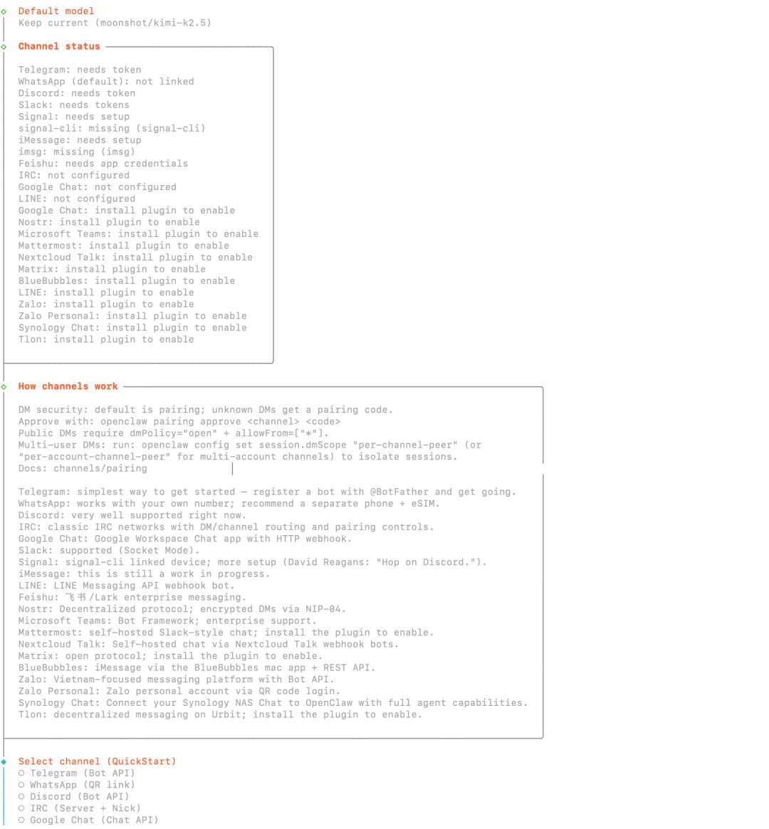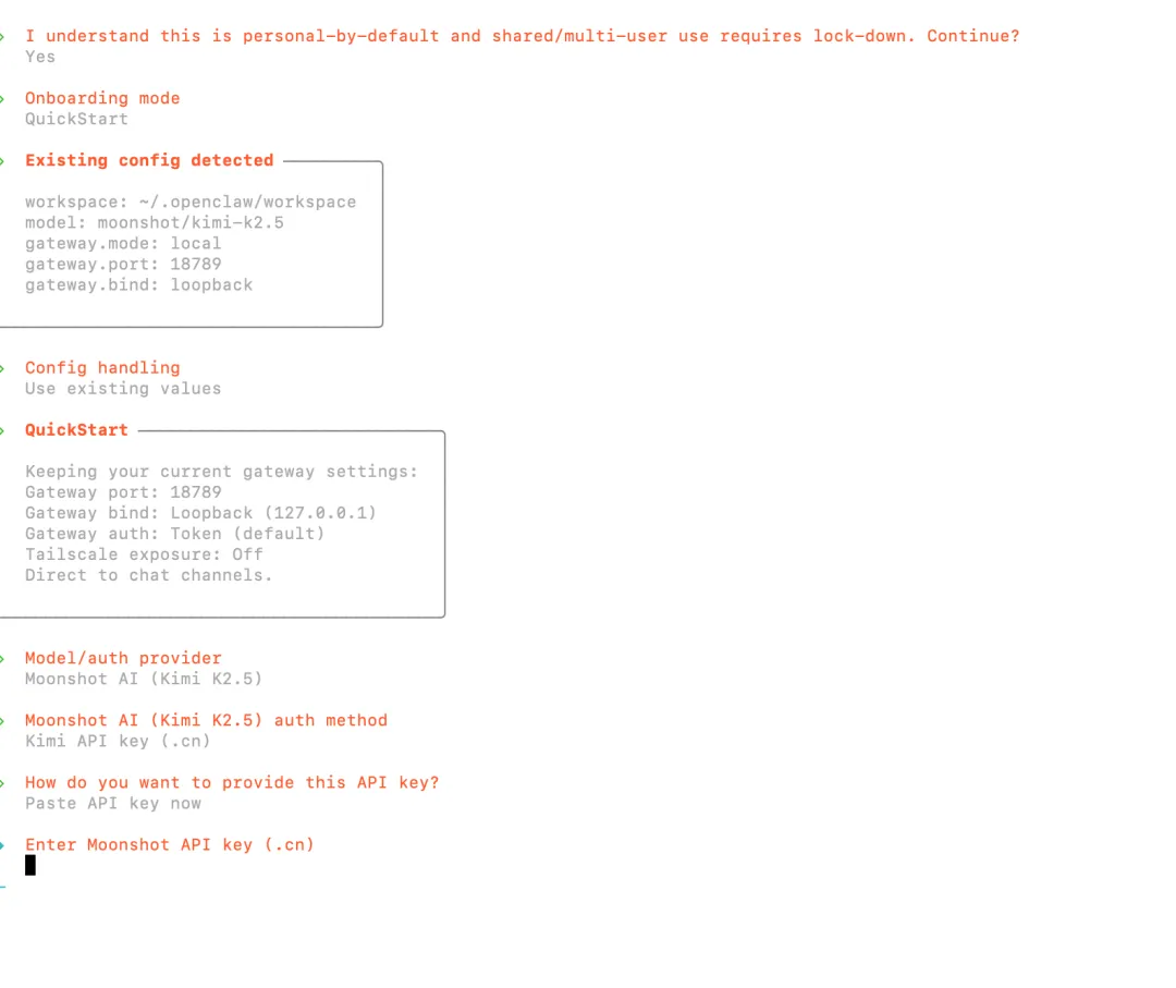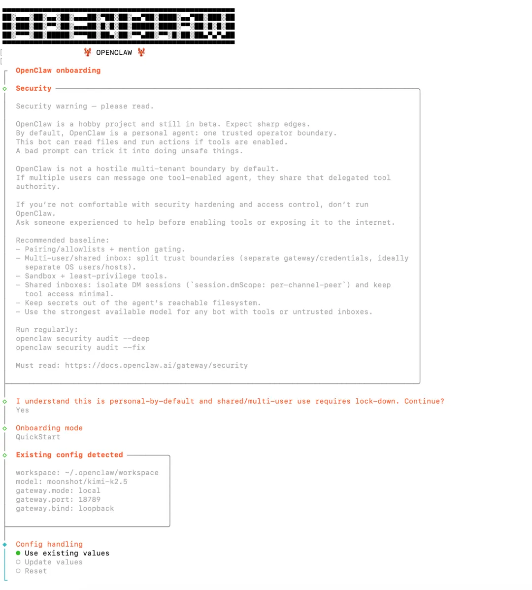 执行完安装命令之后会自动拉起来openclaw onboard这个命令,然后我们跟随着指引做一些quickstart的操作: