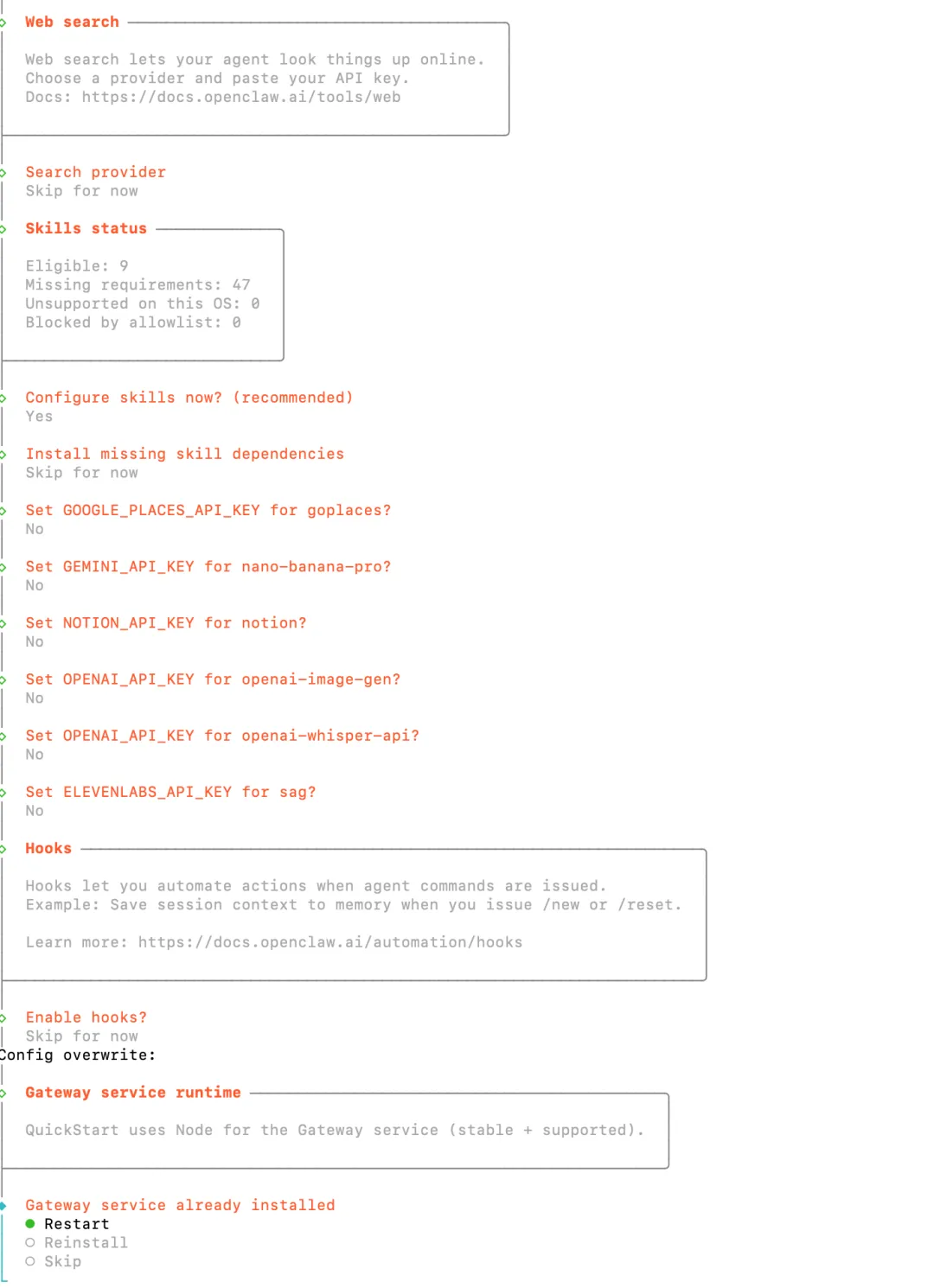 后面的websearch和skill 都先不设置,等后面还有时间再继续探索,今天知识保证openclaw可以先启动起来。