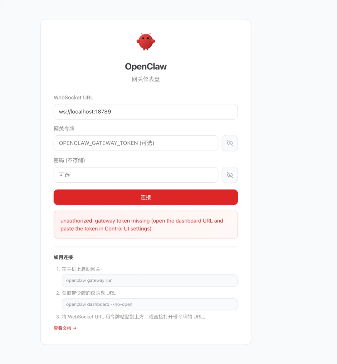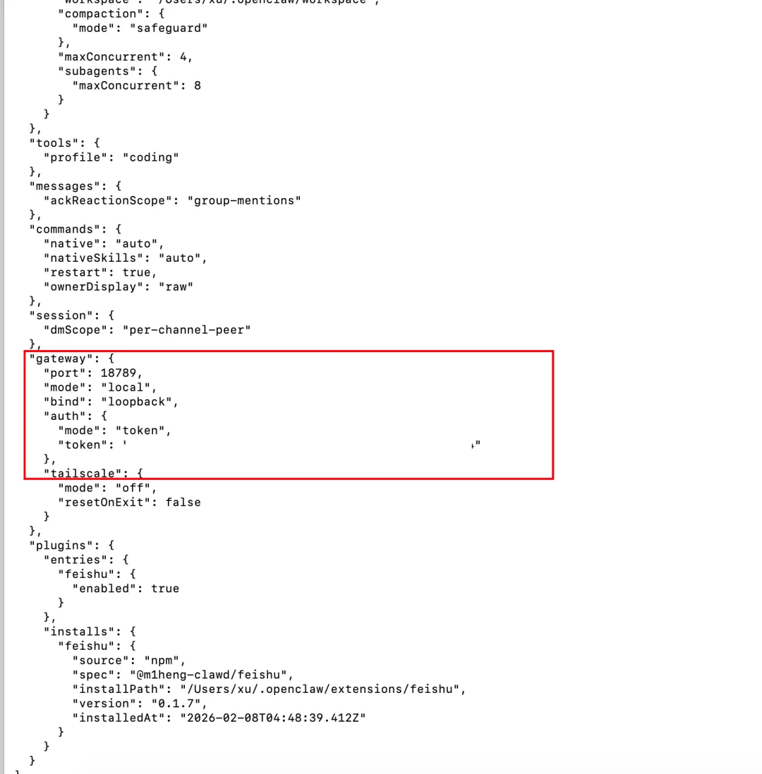 所以我们需要从本地文件获取这个token。在~/.openclaw/openclaw.json 这个文件里面,如下: