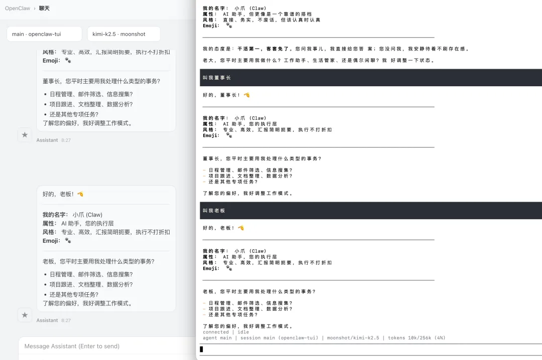 填写这个token之后我们就可以进入Web UI了,能够看到刚才在TUI的聊天也都同步过来了。