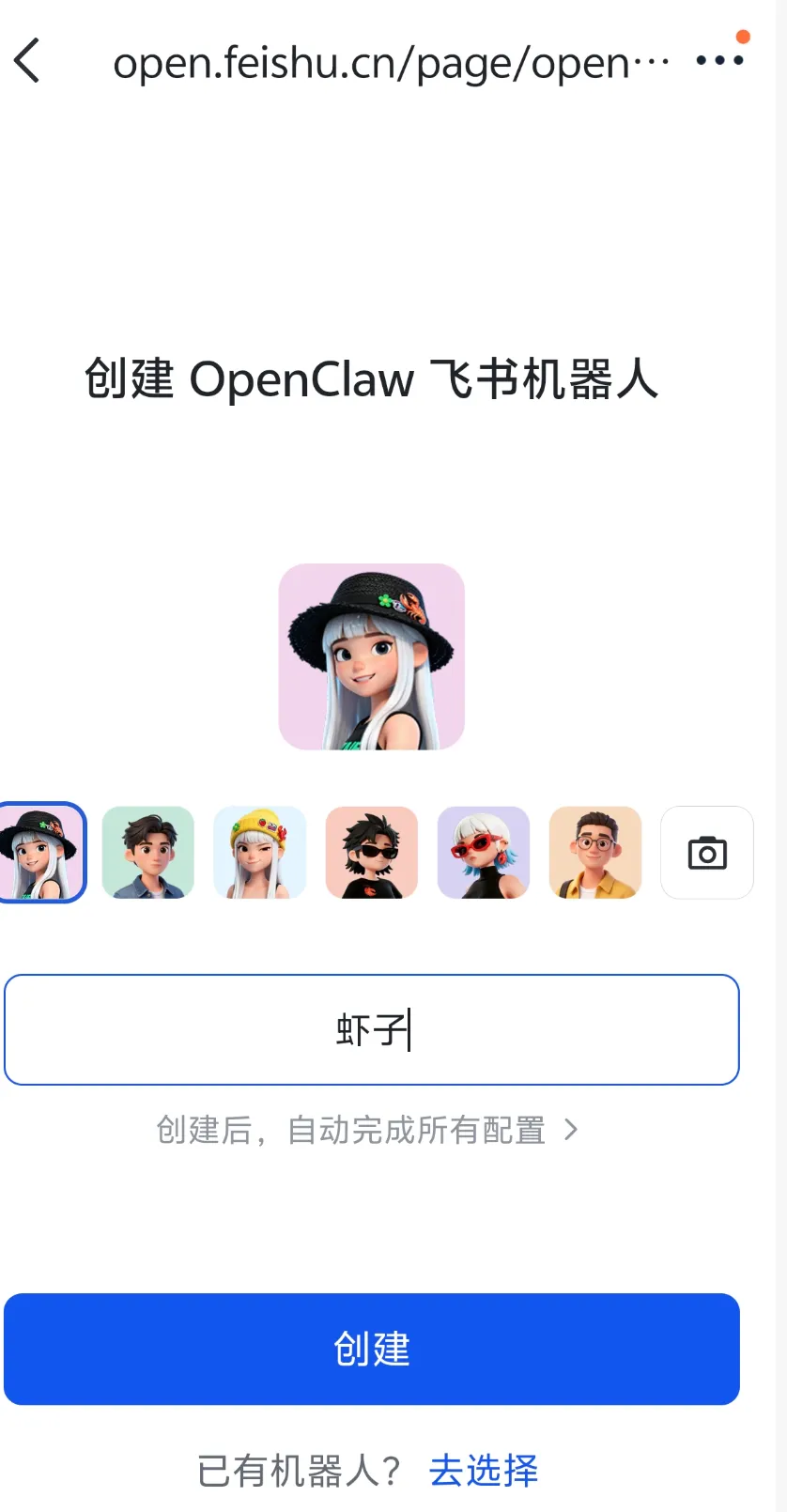 手机飞书扫码之后,我们跳转到这个页面,先设置Bot的名字。