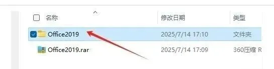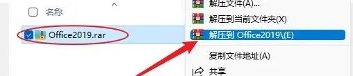 1.鼠标右键点击下载的【Office2019】压缩包,选择【解压到 Office2019】。