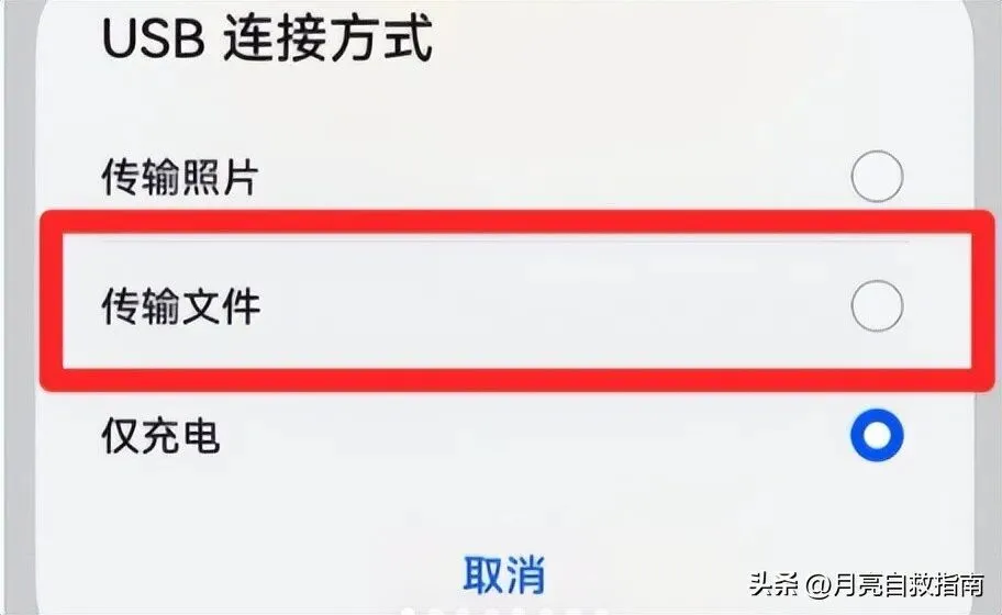 连接数据线,手机选「传输文件(MTP)」