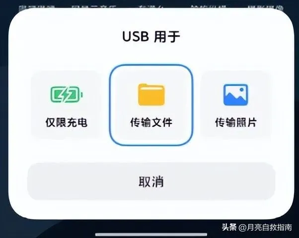 手机下拉通知栏,点击「USB 连接方式」→ 选择传输文件(MTP)(仅充电 / 传输照片 PTP 无法访问全部文件)