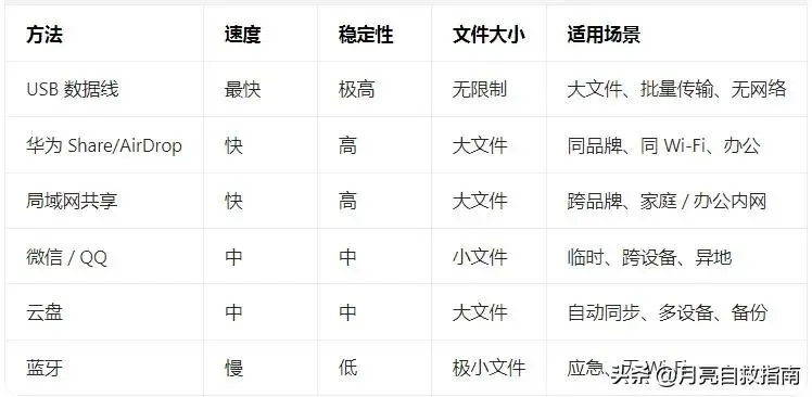 一、有线直连(USB 数据线):通用、稳定、大文件首选