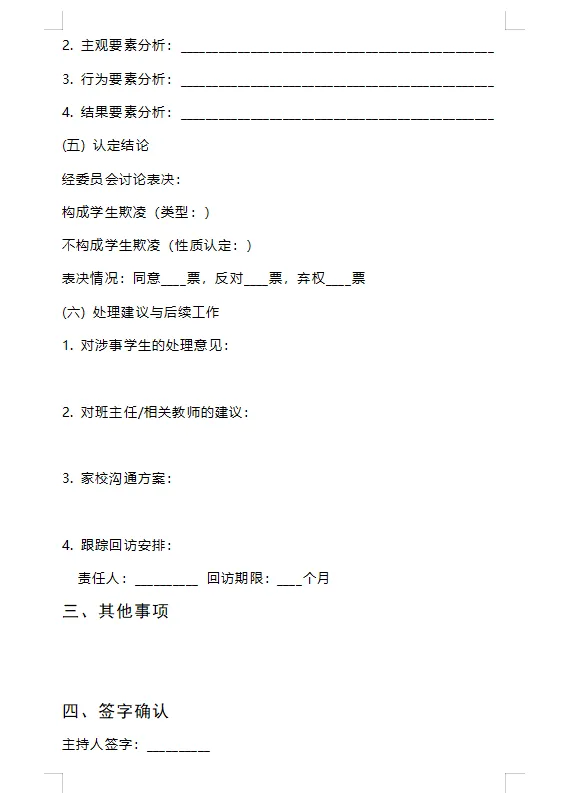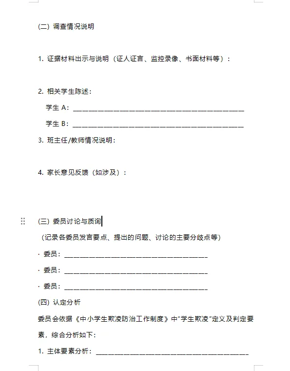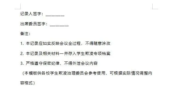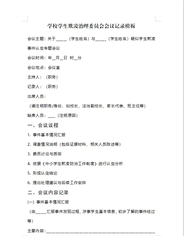 学校学生欺凌治理委员会关于是否发生欺凌事件的认定会议记录模板,适用于小学、初中、中职、高中学校。