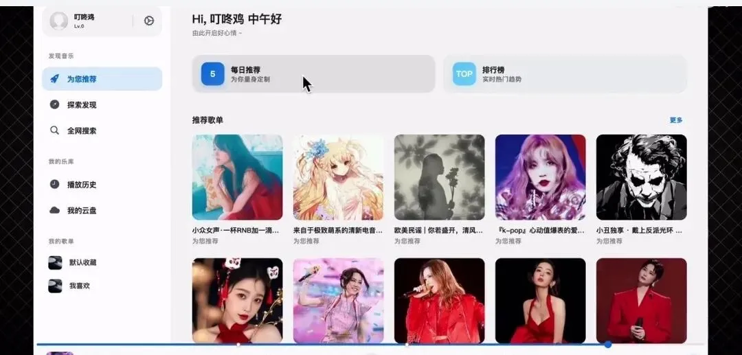 界面设计简洁无广,仅保留搜索、推荐歌单核心功能,UI 质感拉满,给你最纯粹的听歌体验。