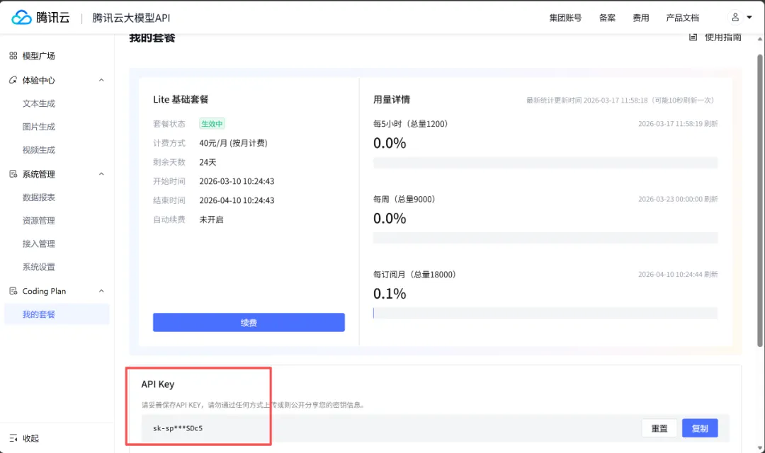 Coding Plan(腾讯云):配置面板选择对应模型→选购套餐→复制API Key→粘贴至面板并应用,完成配置。Tips:包月套餐超出额度不扣费,适合长期部署。