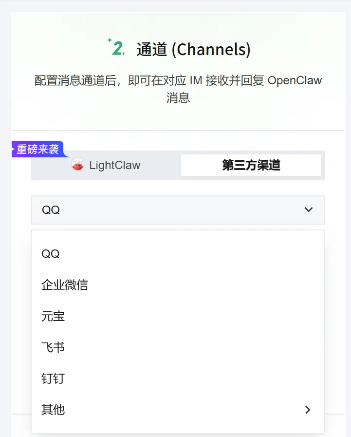 控制台一键接入(新手推荐):进入实例“应用管理”→“通道配置”→选择IM→按指引获取凭证并填写,点击应用即可。