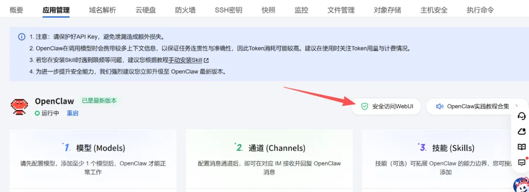 WebUI(Dashboard):默认不支持公网直连,需通过SSH隧道或端口转发访问(本地执行ssh命令,浏览器打开指定地址),保障安全。