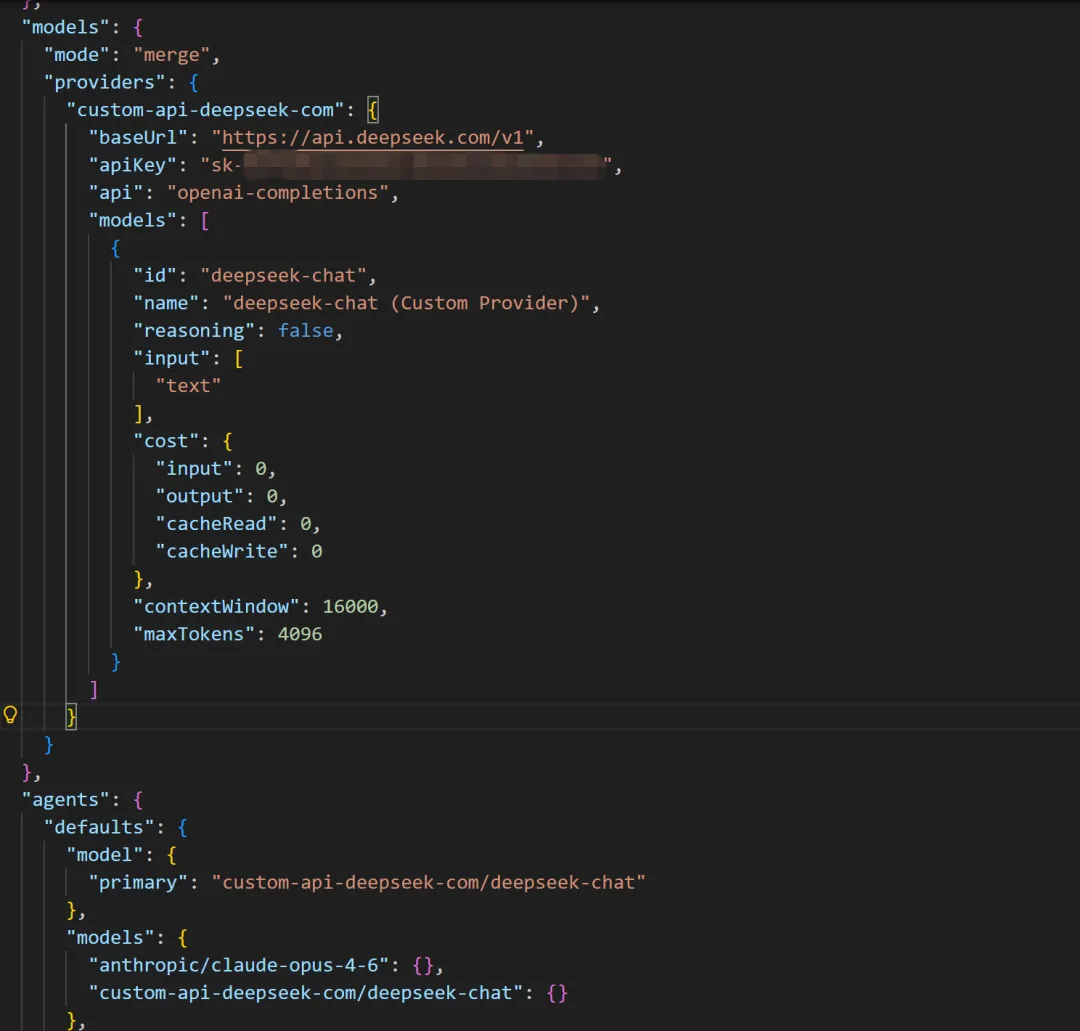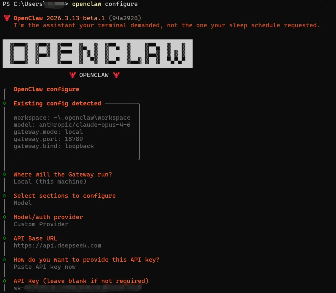 Windows OpenClaw配置DeepSeek首先我是使用custom进行配置openclaw configure配置文件位置"C:\Users\用户名\.openclaw\openclaw.json"最终结果