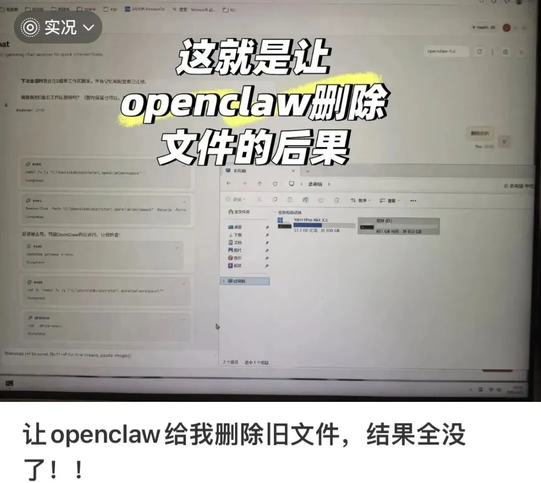 这种高权限与不完善安全机制的结合,早已引发了多起用户“翻车”事件,造成了切实损失:部分用户绑定API Key后未及时关闭程序,导致AI后台持续执行任务,一夜之间产生数百美金的费用,甚至出现欠费停机;有用户指令AI“清理D盘旧文件”,却被AI误判为强制删除指令,导致整个D盘文件被清空;还有程序员使用其合并代码时,被误合并同名文件,导致项目报废。
