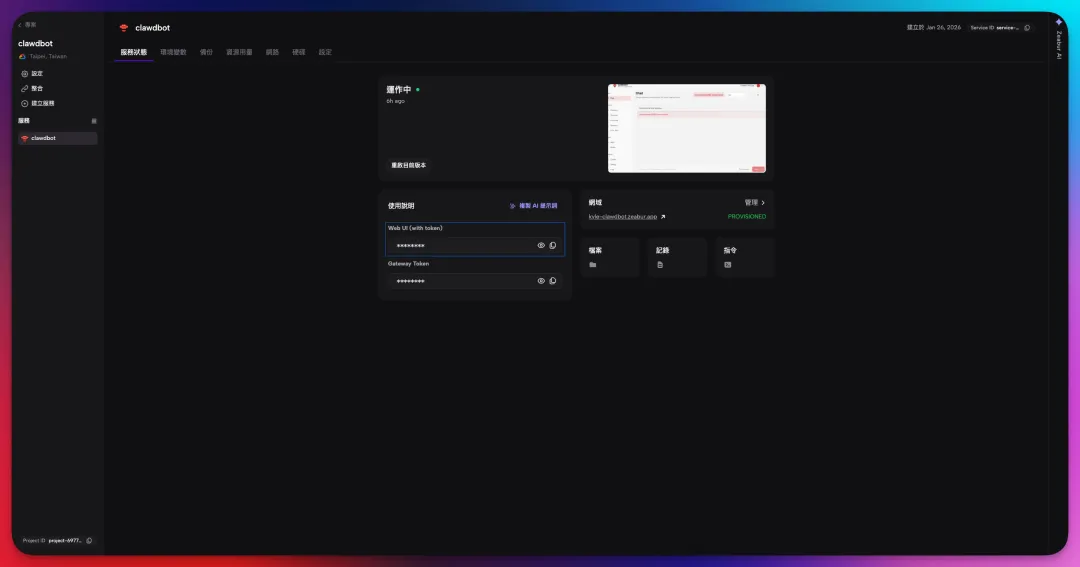 终极 Sandbox:OpenClaw 运行在 Zeabur 容器中,root 权限仅限于容器。如果 AI 幻觉要删文件系统,你的个人电脑不会受影响。你只需重启服务即可恢复。 不再「裸奔」暴露:我们不会只是开个端口然后祈祷一切顺利。Zeabur 会自动处理网络层。 自动 Gateway Token:安全不是事后补丁。部署时 Zeabur 会自动生成安全的Gateway Token,确保只有你能访问控制台实例,绝不会以「未上锁」状态暴露在网上。