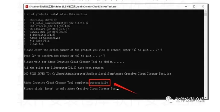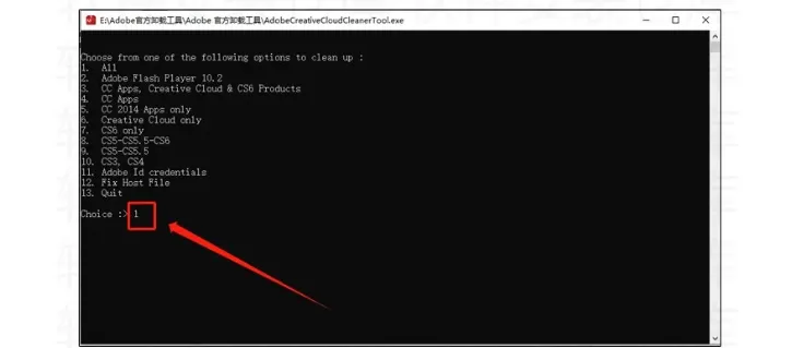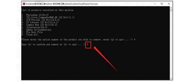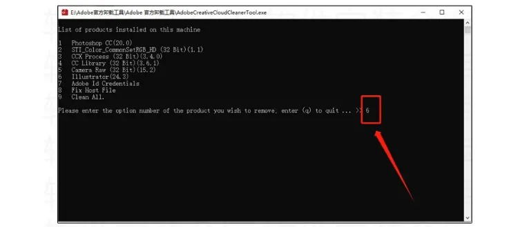 6.软件会自动检测你电脑存在的Adobe软件,此时会提示让你选择想要卸载的程序,你可以输入9全部卸载也可以单独卸载某一种,这里演示清理Al(Iustrator)输入6,然后按回车键,