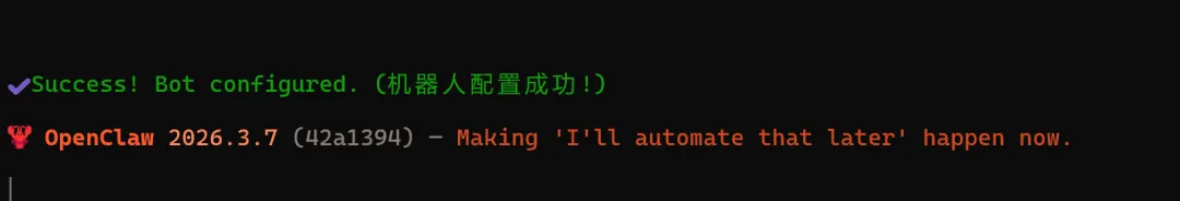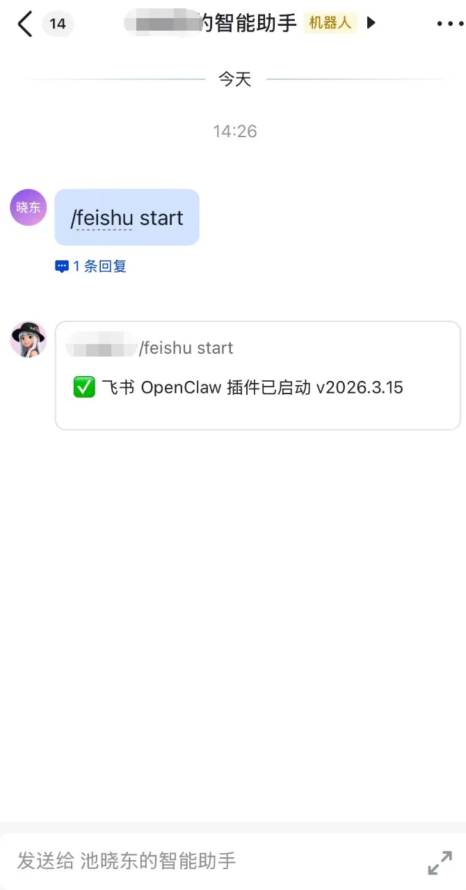上面已经完成了安装,来验证是否安装成功,在飞书APP上,打开机器人对话窗口,输入:/feishu start,若返回了版本号信息,则代表安装成功。
