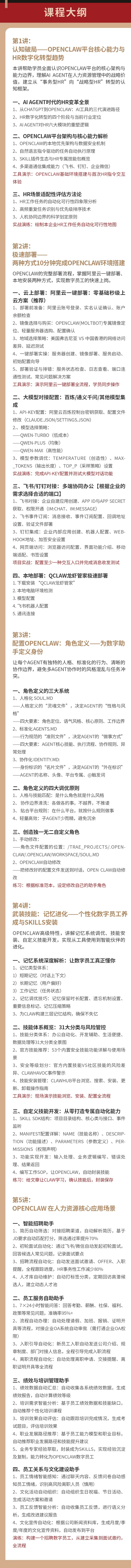 课程内容覆盖OpenClaw应用全流程,且与HR各模块工作深度关联,让HR能做到学完就会部署自己的AI数字员工。