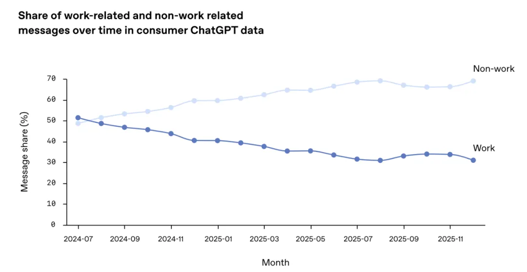 消费者 ChatGPT 数据中与工作相关和非工作相关消息随时间变化的份额