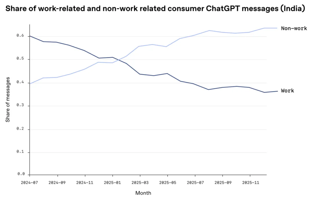 在印度,近三分之二的消费级ChatGPT消息被归类为非工作相关,略多于三分之一与工作相关。这与早期工作用途占主导的格局形成了鲜明对比。直到2025年初,非工作相关消息才开始增多,并持续分化。
