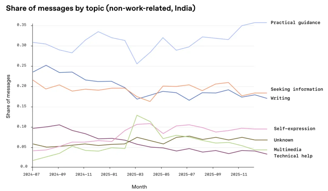这表明,在个人生活中,印度人将AI视为学习伙伴、问答引擎和生活规划助手。